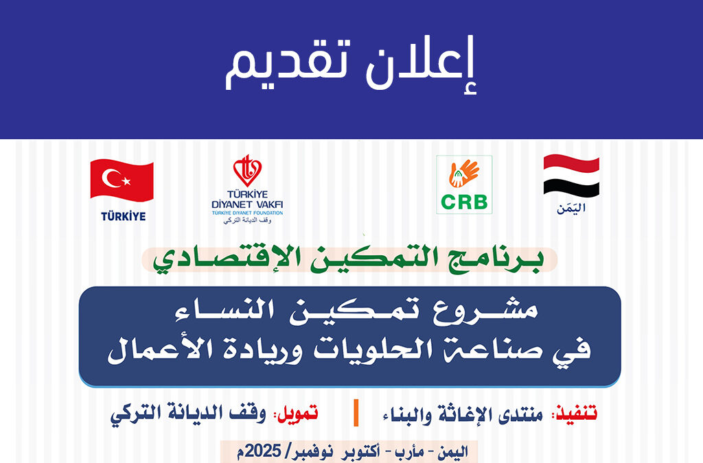 أكتوبر 14, 2025يسر منتدى الإغاثة والبناء أن يعلن عن فتح باب التقديم لمشروع “تمكين النساء اقتصاديًا من خلال التدريب في صناعة الحلويات وريادة الأعمال”، الذي يهدف إلى دعم النساء في محافظة مأرب لامتلاك المهارات والمعرفة اللازمة لبناء مشاريعهن الصغيرة وتحسين مستوى دخلهن المعيشي.
