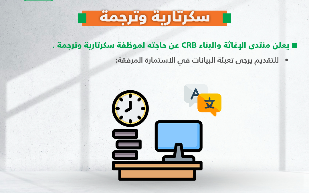يناير 17, 2026يعلن منتدى الإغاثة والبناء CRB عن حاجته لموظفة سكرتارية وترجمة – محافظة مأرب، تمتلك خبرة مثبته في العمل مع المنظمات الإنسانية.