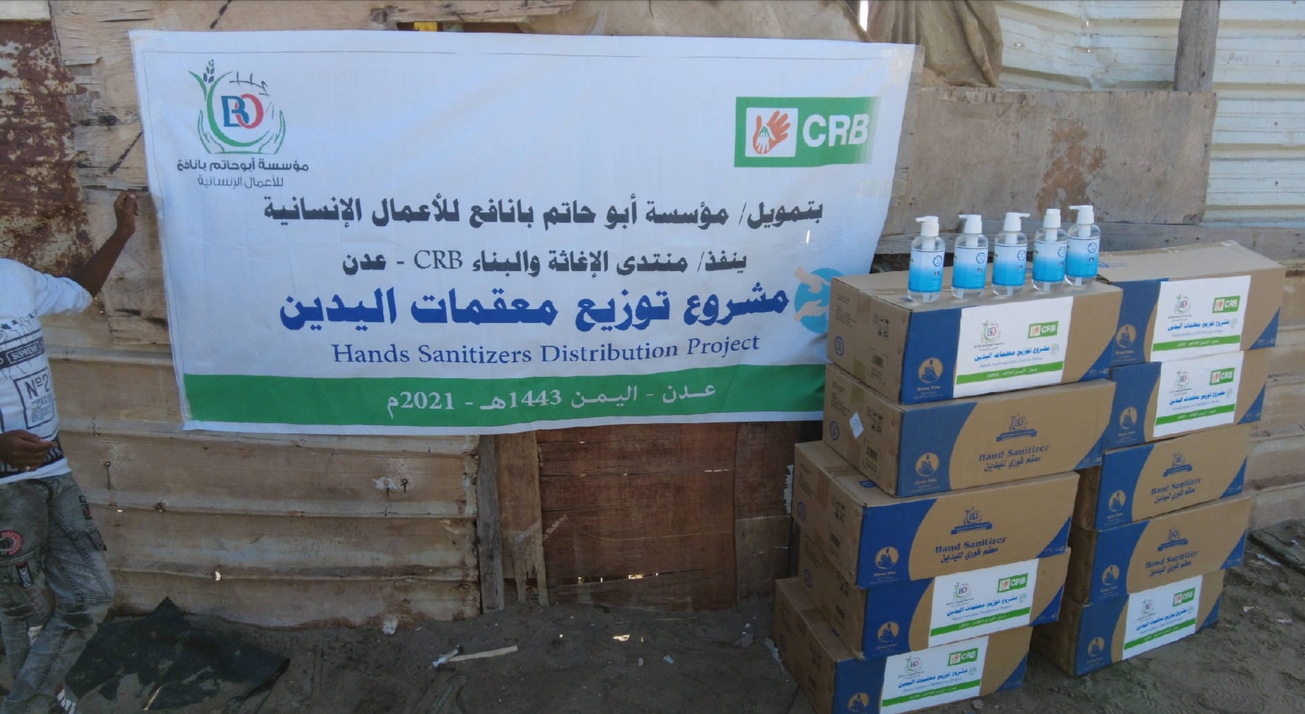 Coalition of Relief and Building (CRB) distributes hand sanitizers in IDP camps in Aden, Yemen.