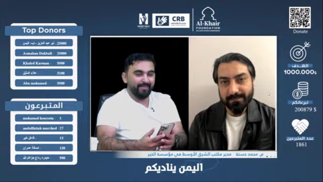 ويمكن للجميع الانضمام إلى حملة التبرّع والمساهمة فيها، وذلك عبر الدخول إلى البث المباشر https://www.youtube.com/watch?v=Y7lk4ttoFIo والضغط على رابط التبرّع: https://alkhaircharity.org/yemen.