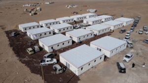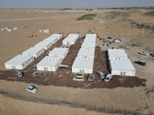 ويؤمن المشروع سكنًا لكل أسرة مستهدفة مكونًا من غرفة ومطبخ وحمام، بالإضافة إلى أثاث متكامل وسلة غذائية، كما يؤمًّن خزان مياه تجميعي وشبكة مياه، وكهرباء وصرف صحي.