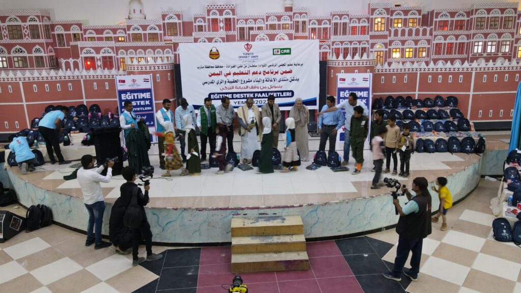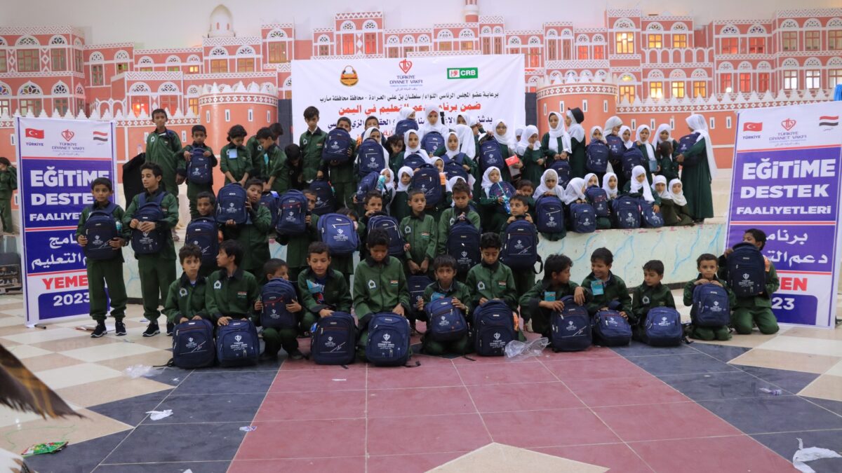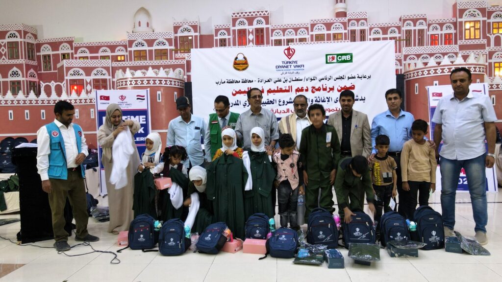 The CRB inaugurated the school bag and uniform distribution project within the education support program in Yemen , funded by the Turkish Religious Endowment, and sponsored by member of the presidential council Ma’rib Governor, Major General Sultan Al-Arada .