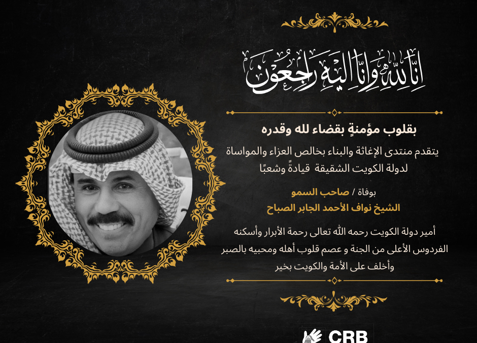بألم بالغ يشاطر منتدى الإغاثة والبناء CRB، شعب الكويت الشقيق والأمة العربية والإسلامية والإنسانيّة جمعاء، الحزن والأسى لرحيل سمو الأمير الشيخ نواف الأحمد الجابر الصباح، الذي رحل تاركًا خلفه مواقف وانجازات جمّة ورائدة في العمل الإنساني بمختلف أقطار الأرض.