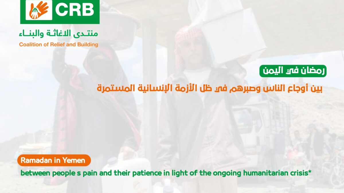 منتدى الإغاثة والبناء CRB، واحد من المنظمات الإنسانية الفاعلة في اليمن، وعمل بشكل كثيف في تخفيف المعاناة الإنسانية خلال شهر رمضان، في مجالات الأمن الغذائي، والمساعدة الطارئة، والحماية، للمساهمة في تأمين جزء من احتياجات المواطنين اليمنيين، وتوفير متطلبات المجتمعات الأشد تضررًا في البلاد.