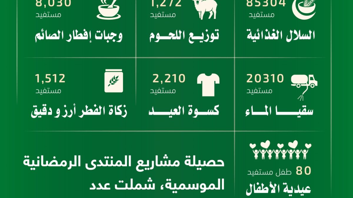 وقال رئيس المنتدى الدكتور كمال القدمي، “إنّ حصيلة مشاريع المنتدى الرمضانية الموسمية، شملت عدد (118.718) فرد مستفيد، في محافظات، مأرب، عدن، الحديدة، تعز، حضرموت، ذمار، صنعاء، عمران.
