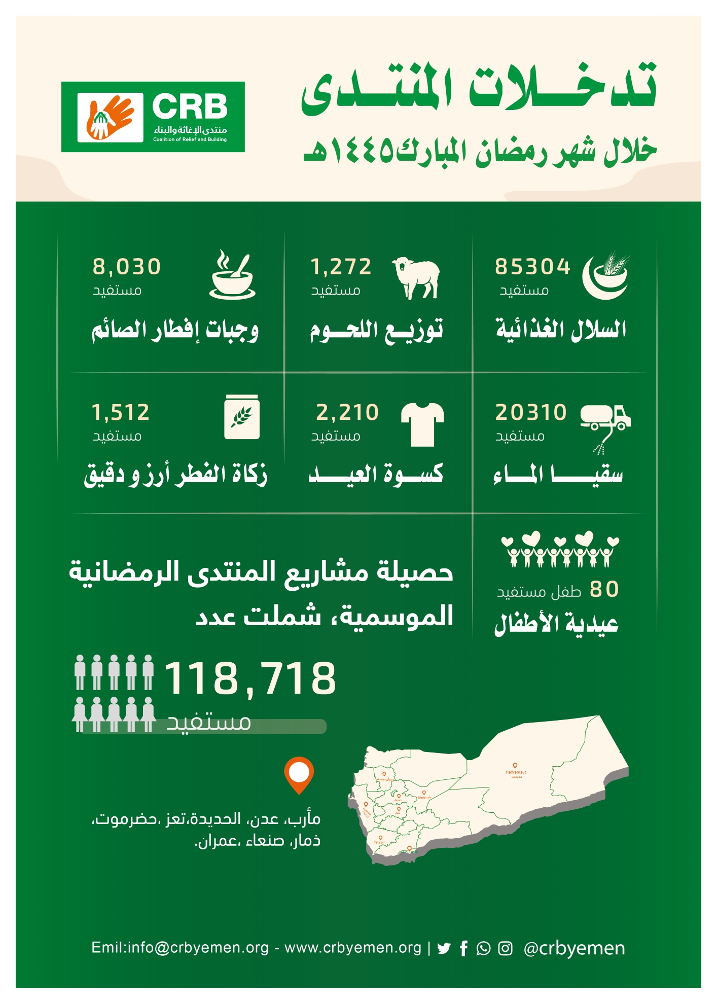 أبريل 21, 2024اختتم منتدى الإغاثة والبناء CRB، مشاريعه الرمضانية الموسمية، بمختلف المجالات الإنسانية، لعامنا هذا 1445هـ، في عدد من المحافظات اليمنية.