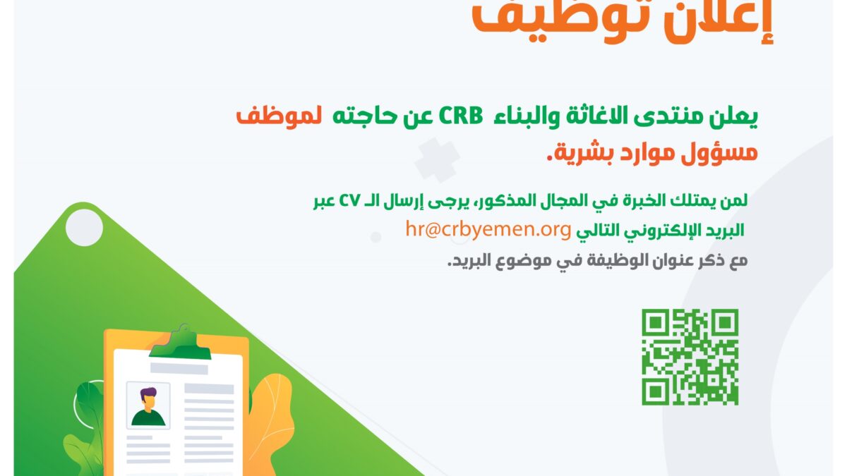 أبريل 29, 2024يعلن منتدى الإغاثة والبناء CRB عن حاجته مسؤول موارد بشرية – محافظة مأرب، حاصل على شهادة بكالوريوس في الإدارة أو ما يعادلها، ويتمتع بخبرة لا تقل عن سنة، في العمل بنفس المجال في المنظمات الإنسانية والتنموية.