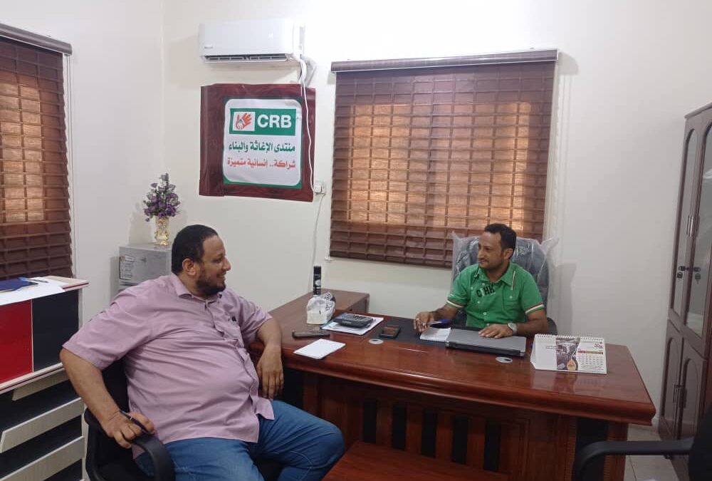 استقبل مدير منتدى الإغاثة والبناء CRB – مكتب عدن، الأستاذ محمد هادي، اليوم الخميس، مدير فروع الوحدة التنفيذية لإدارة مخيمات النازحين الأستاذ عبده مهذب، لمناقشة احتياجات النازحين في مجال الأضاحي.