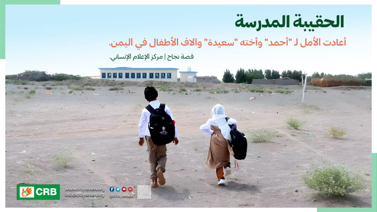 ومع بداية العام الدراسي زار فريق من منتدى الإغاثة والبناء CRB قرية احمد وأخته سعيدة، في إطار مشروع دعم التعليم في اليمن الذي ينفذه المنتدى بدعم من وقف الديانة التركي، حينما وصل الفريق إلى منزلهما استقبلهما بكل حزن وألم على الحال اللذان وصلا إليه نتيجة الوضع الاقتصادي الصعب الذي حال دون التحاقهم بالمدرسة، ولكن سرعان ما انقلب هذا الحزن إلى سعادة غامرة عندما علموا أن الحقيبة المدرسية ستكون من نصيبهم، ونصيب 500 طالب وطالبة من الحالات المشابهة لـ أحمد وسعيدة بمحافظة الحديدة، و5 آلاف حقيبة بست محافظات يمنية أخرى.
