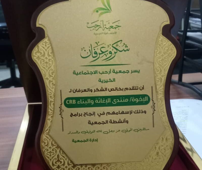 مارس 11, 2025تسلم منتدى الإغاثة والبناء CRB، اليوم الأحد، درع شكر وعرفان، من جمعية أرحب الاجتماعية الخيرية، تقديرًا للجهود الحثيثة في خدمة المجتمع وتخفيف معاناة السكان، ونظير إسهام المنتدى في إنجاح برامج وأنشطة الجمعية.